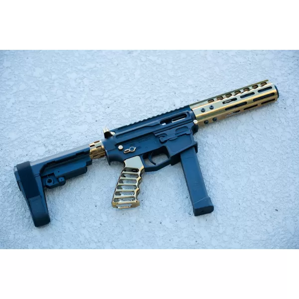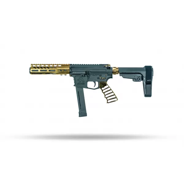 Moriarti Arms, Blow Back, 9MM, 7.5″ Barrel, Gold Plated, Slick Side, LRBHO, SBA3 Brace